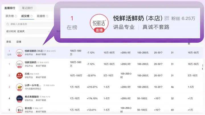 悦鲜活实现GMV月均破百万,客单价提升101%,笔记引导支付金额提升75%+。持续霸榜小红书乳制品行业直播成交榜!