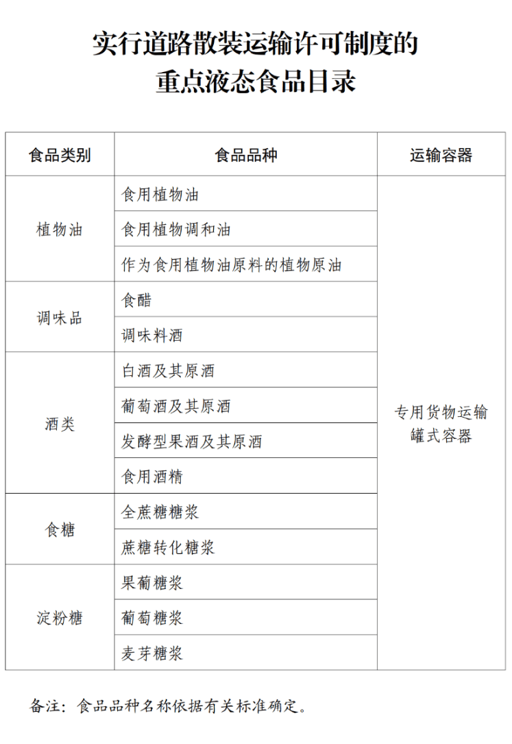市场监管总局、交通运输部、国家粮食和储备局近日发布公告,三部门联合制定并公布实行道路散装运输许可制度的重点液态食品目录。
